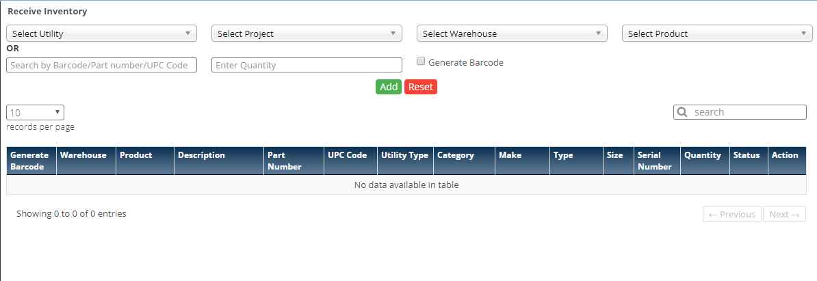- This screen is used to add inventory into the warehouse one by one.