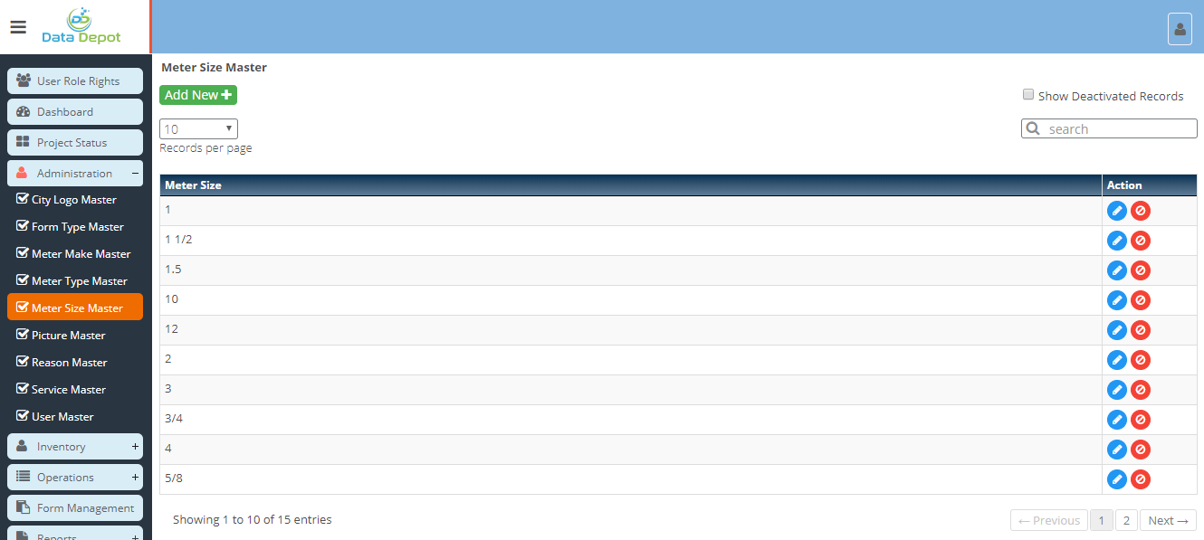 - Meter sizes can be edited and deleted through this master.